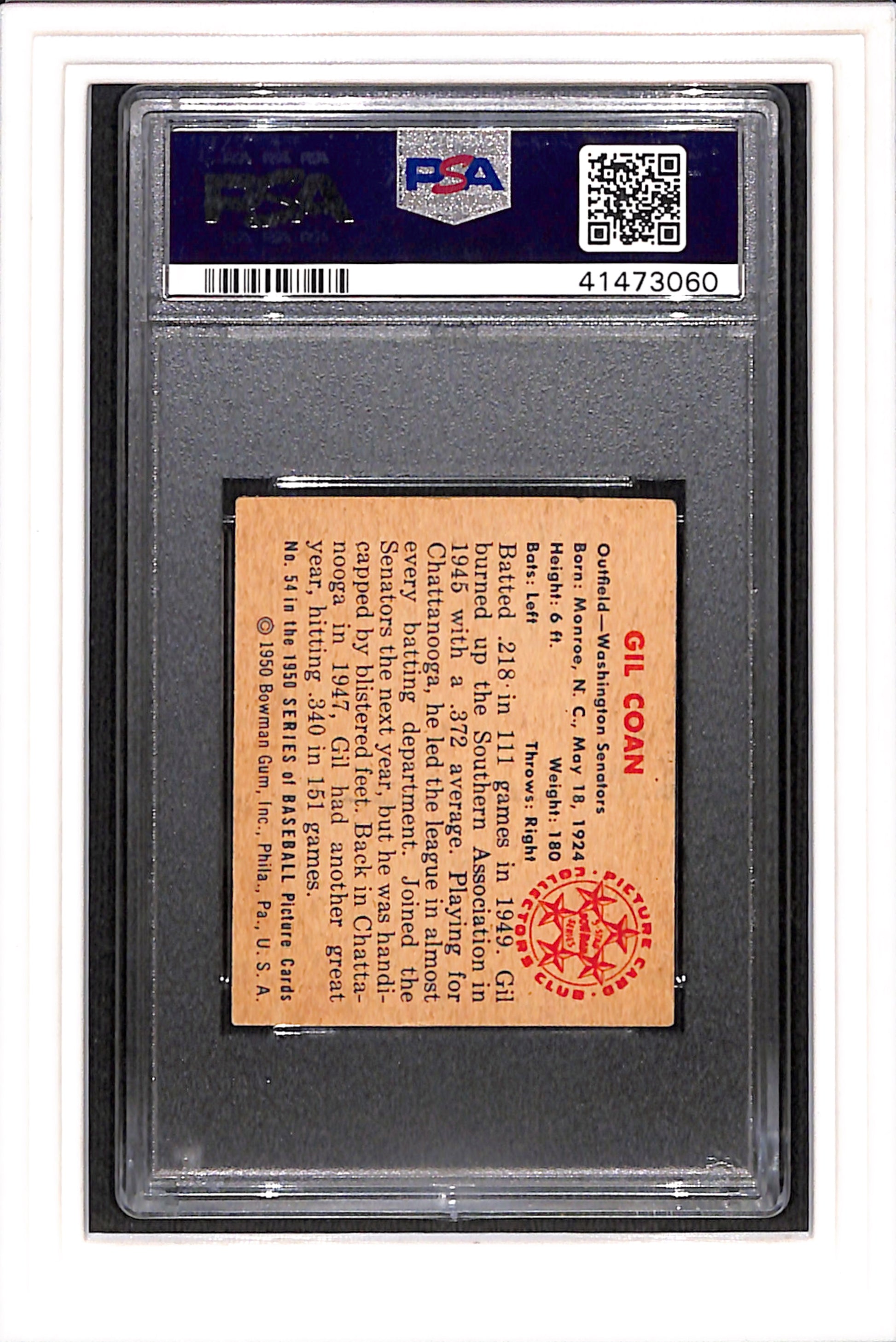 1950 Bowman #54 Gil Coan PSA 4 SN 41473060