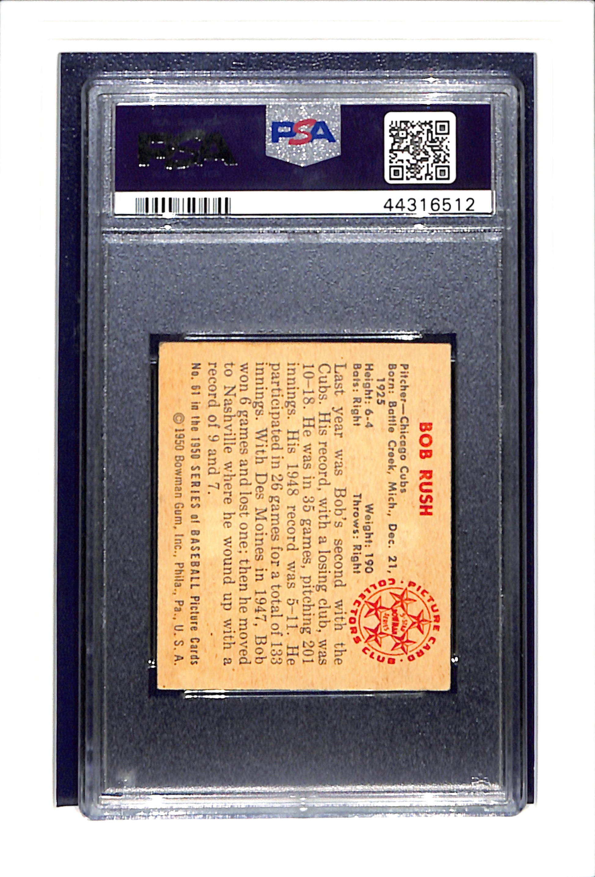 1950 Bowman #61 Bob Rush PSA 4 SN 44316512