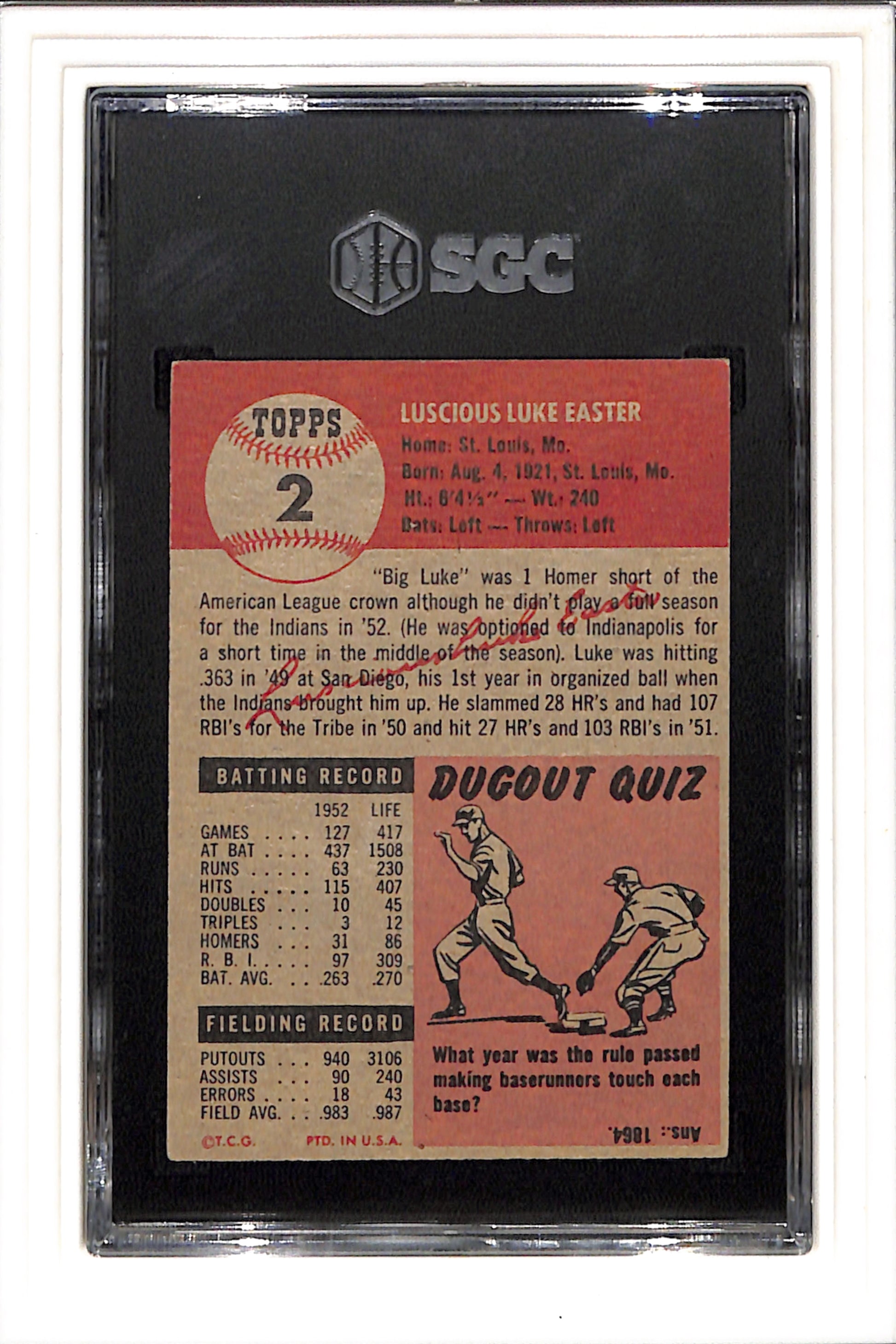 1953 Topps #2 Luke Easter SGC 5.5 SN 0238640