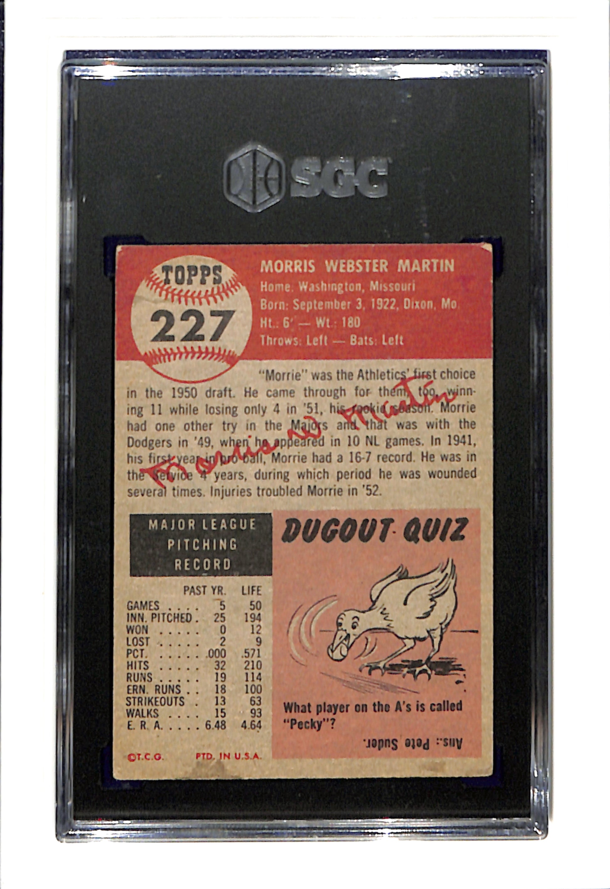 1953 Topps #227 Morrie Martin - Philadelphia Athletics SGC 4 SN 8863262