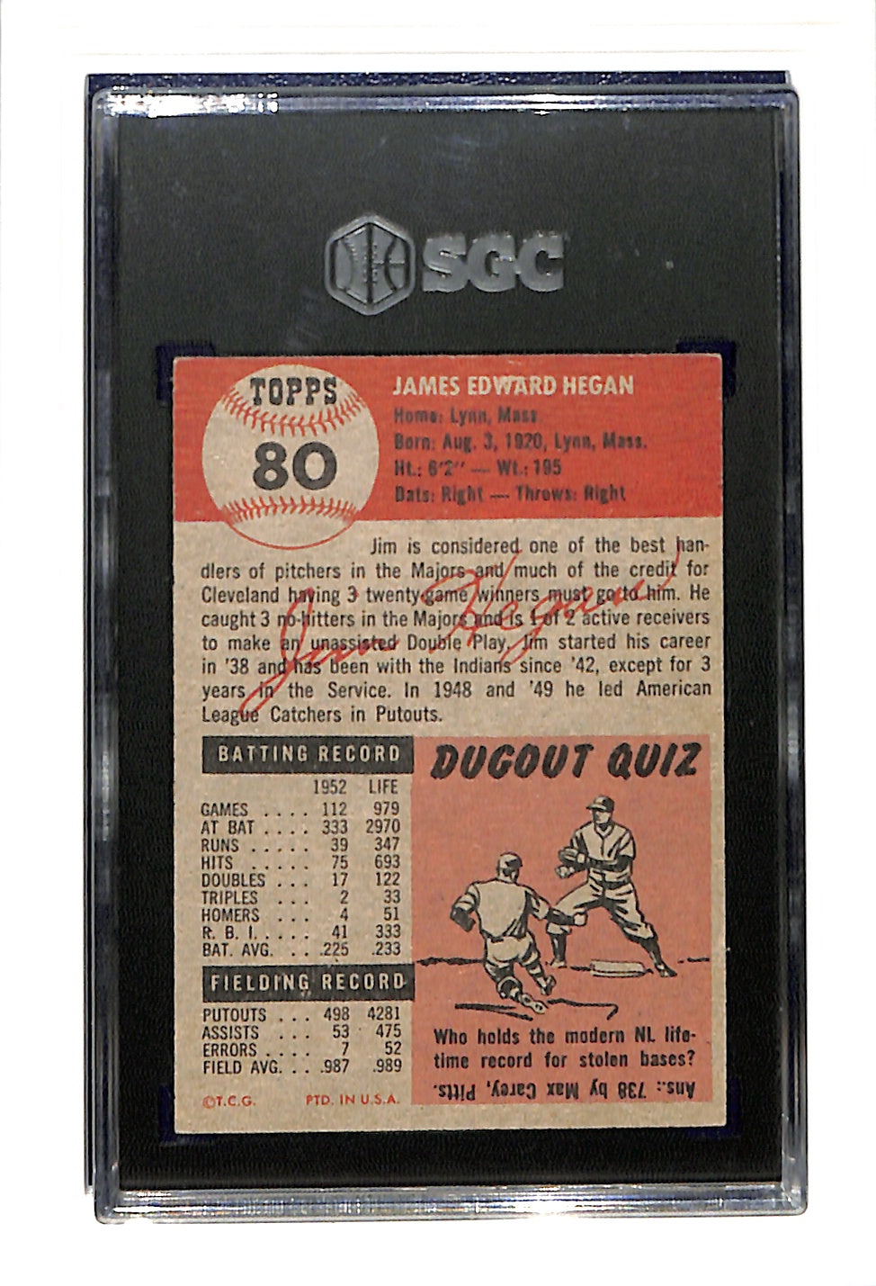 1953 Topps #80 Jim Hegan - Cleveland Indians SGC 4