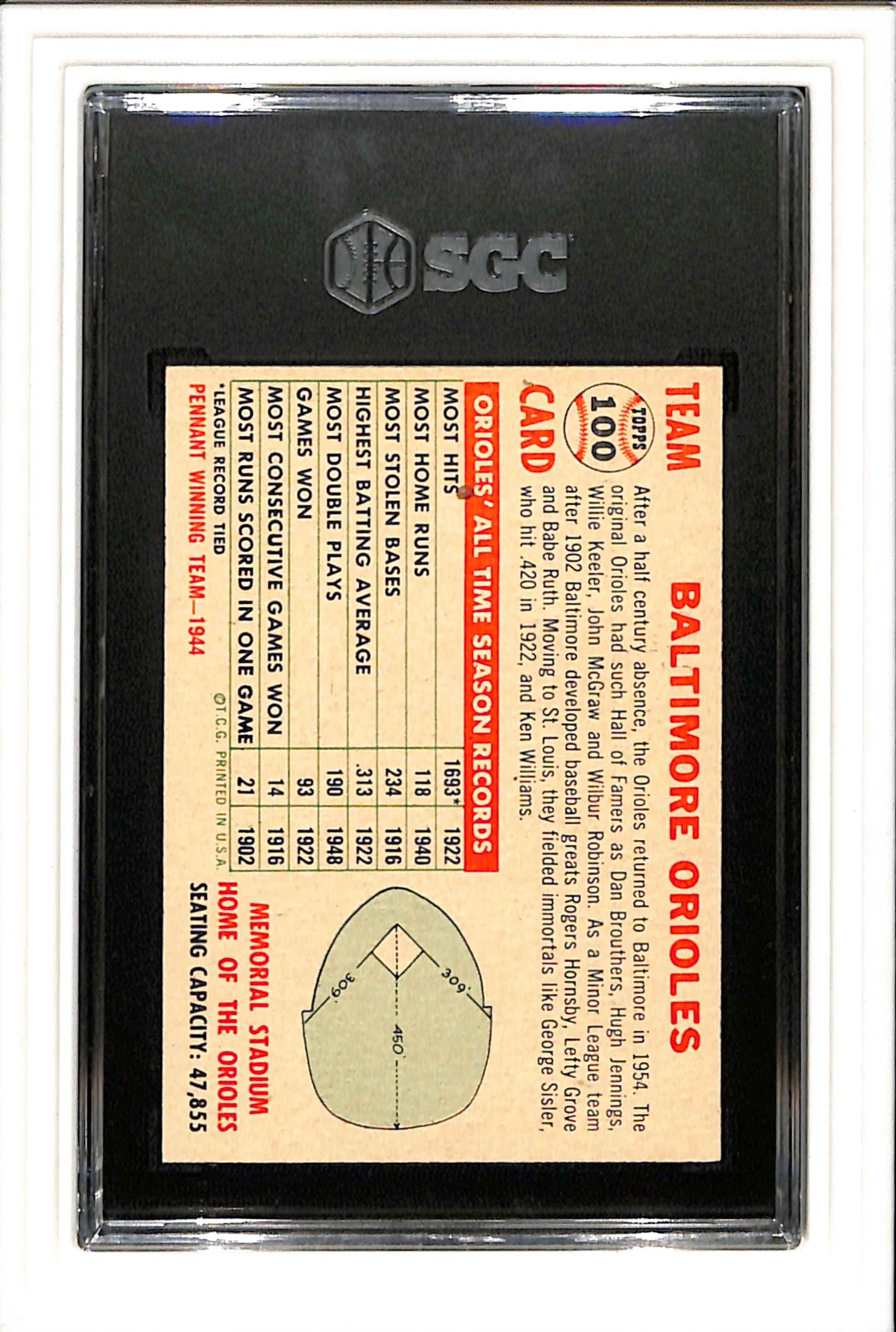 1956 Topps #100 Baltimore Orioles Name Centered White Back SGC 4 SN 6936446