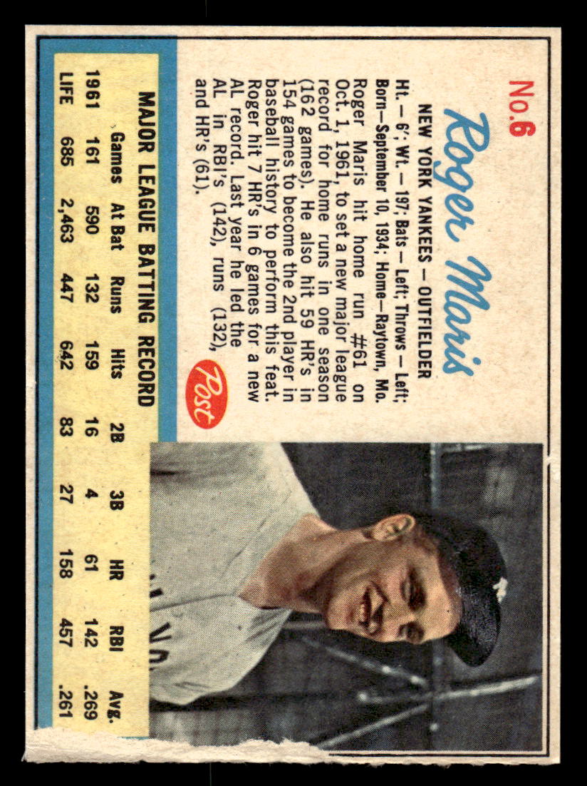1962 Post Cereal #6 Roger Maris-Perforated-Ad Back Life Magazine
