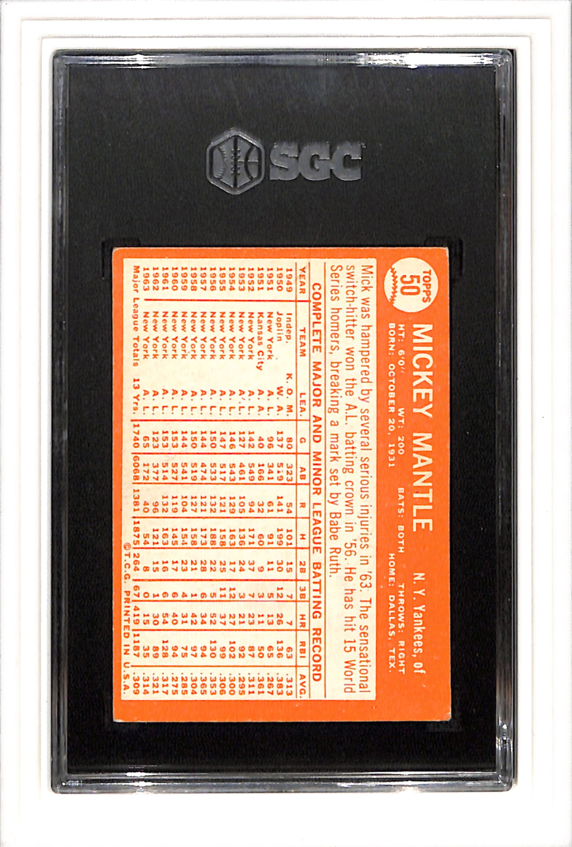 1964 Topps #50 Mickey Mantle SGC 4 SN 3133760