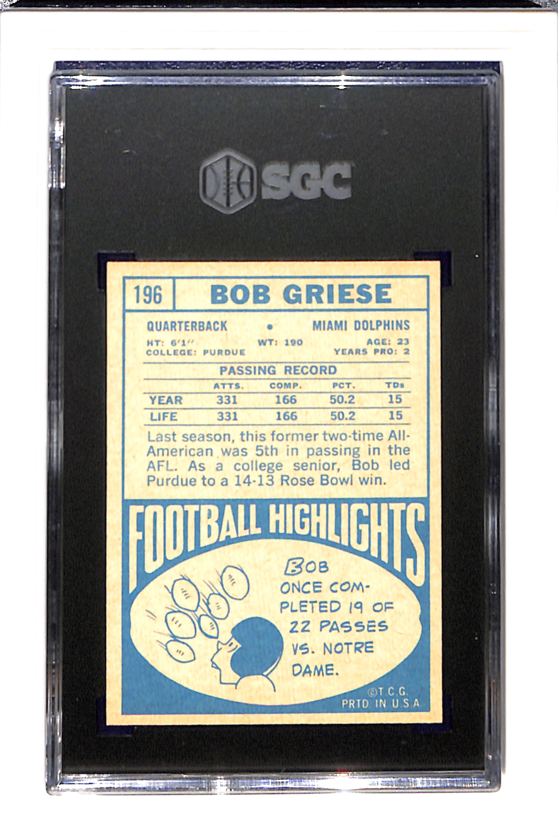 1968 Topps #196 Bob Griese RC SGC 7 SN 7009410