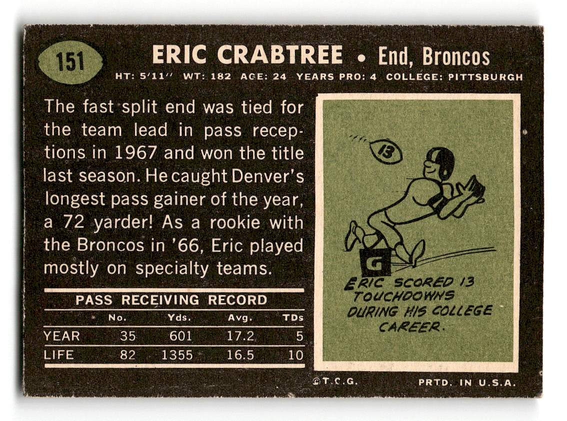 1969 Topps #151 Eric Crabtree Denver Broncos EX