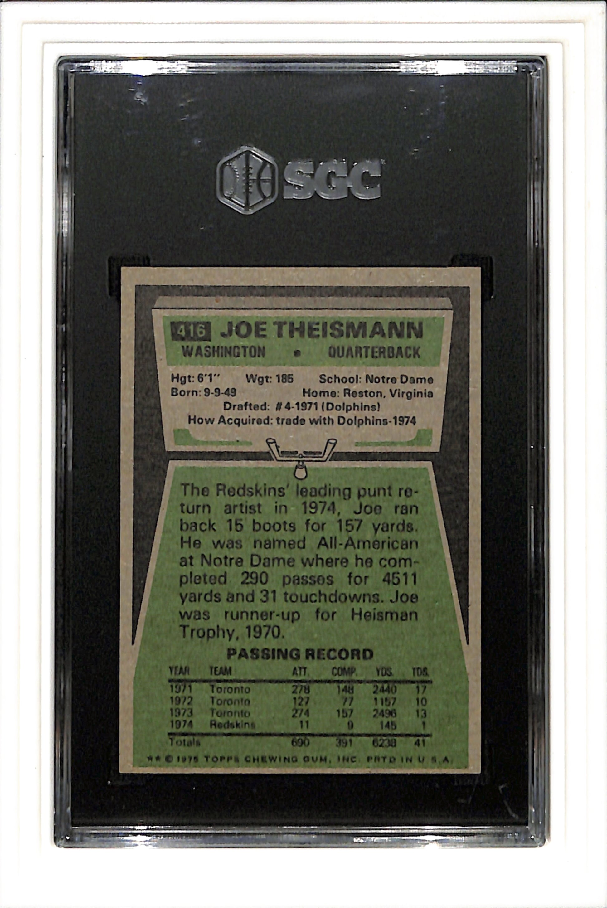 1975 Topps #416 Joe Theismann SGC 7 SN 9541775